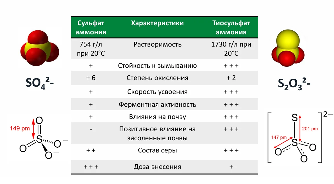 Благодаря специфическому химическому строению молекулы Thio-Sul® (NH4)2S2O3 при взаимодействии с грунтовым средой и влагой он распадается с образованием соединений (NH4)2SO3 и элементарной серы (S). Первое соединение вскоре распадается на ионы NH4+ и SO32-, которые сразу становятся доступными для корневой системы растений как источник азота и серы. Элементарная сера (S) в течение 2-3 недель из-за деятельности сульфатредуцирующих бактерий рода Thiobacillus окисляется до формы SO32- и становится доступной для растений. То есть Thio-Sul® способен обеспечивать растения на 2 формы серы, одна из которых – пролонгирована.
